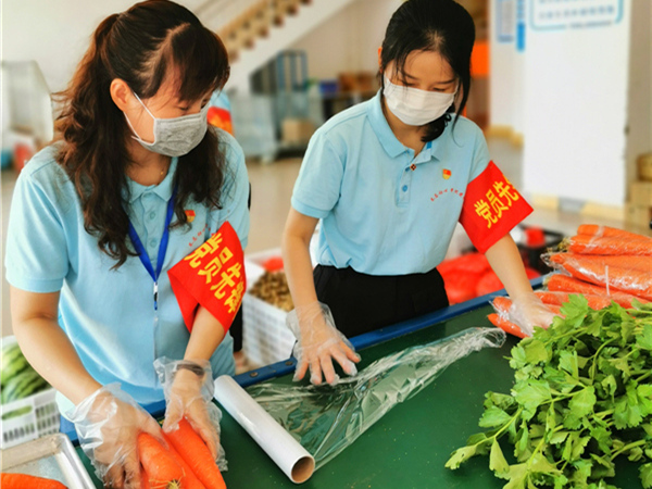 海南省保亭縣紀委監(jiān)委第一黨支部組織黨員先鋒隊下沉一線,保障疫情期間群眾的蔬菜供應。(海南省保亭縣紀委監(jiān)委 王秋婷 攝)