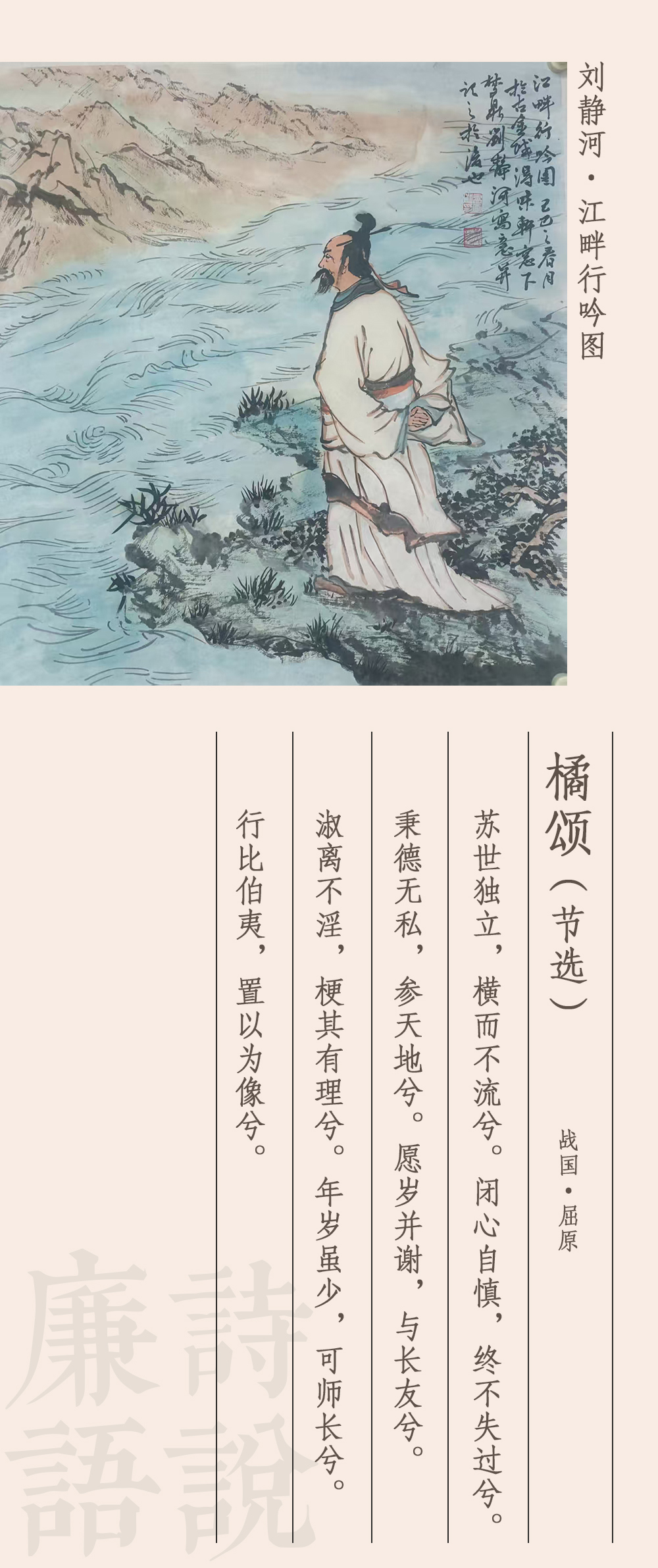 《橘頌》被譽(yù)為中國(guó)最早的詠物詩(shī)。據(jù)考證,屈原在流放之初,苦悶憤激,看到南國(guó)的橘樹,心有所觸,將橘樹人格化,賦予其君子仁人的品格,寫下了這首詩(shī)。詩(shī)分兩部分,前半部分寫實(shí),刻畫了橘樹的生長(zhǎng)習(xí)性和枝葉花果,后半部分抒情議論,托物言志,橘人合一,情景交融。這里節(jié)選了后半部分,大意如下:清醒立世啊不隨波逐流,小心謹(jǐn)慎啊過失從不留,沒有私欲啊與天地比儔,我與你同生死啊永結(jié)為好友,你形象美好啊耿直作一流,你風(fēng)華正茂啊堪為好師長(zhǎng),你高潔比伯夷啊榜樣最優(yōu)秀。