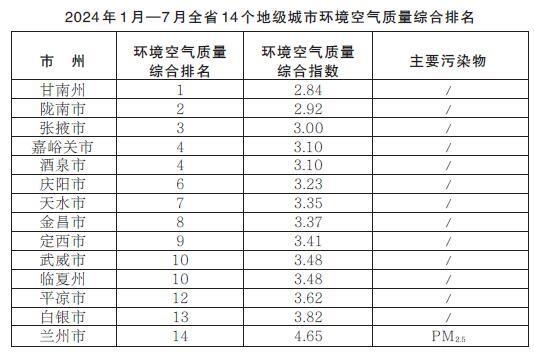 2024年1月—7月,全省14個地級城市環(huán)境空氣質(zhì)量綜合排名由高到低分別為:甘南州、隴南市、張掖市、嘉峪關(guān)市、酒泉市、慶陽市、天水市、金昌市、定西市、武威市、臨夏州、平?jīng)鍪?、白銀市、蘭州市。