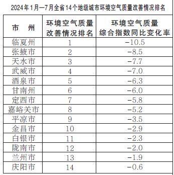 2024年1月—7月,全省14個地級城市環(huán)境空氣質(zhì)量改善情況排名由好到差分別為:臨夏州、張掖市、天水市、武威市、酒泉市、甘南州、定西市、嘉峪關(guān)市、平?jīng)鍪?、金昌市、白銀市、隴南市、蘭州市、慶陽市。
