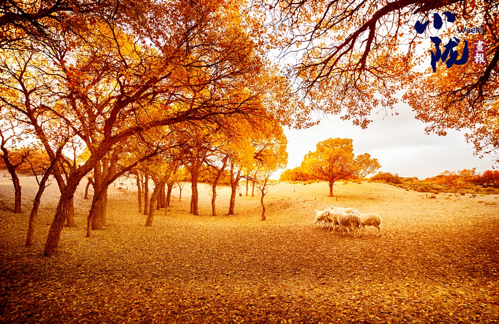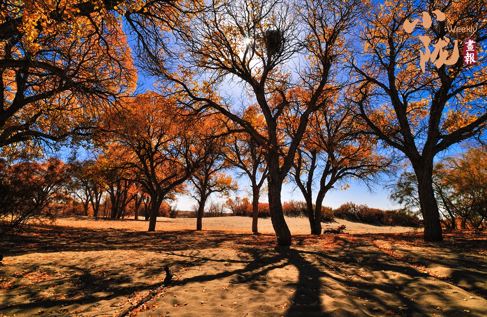 當秋風(fēng)吹過金黃的胡楊樹葉,整片戈壁便成了被陽光熔化的鎏金海洋,輝煌而凝重。這些古老的生命已經(jīng)在這片土地上存活了數(shù)千年,它們以“生千年不死、死千年不倒、倒千年不朽”的姿態(tài)站立成永恒的風(fēng)骨。