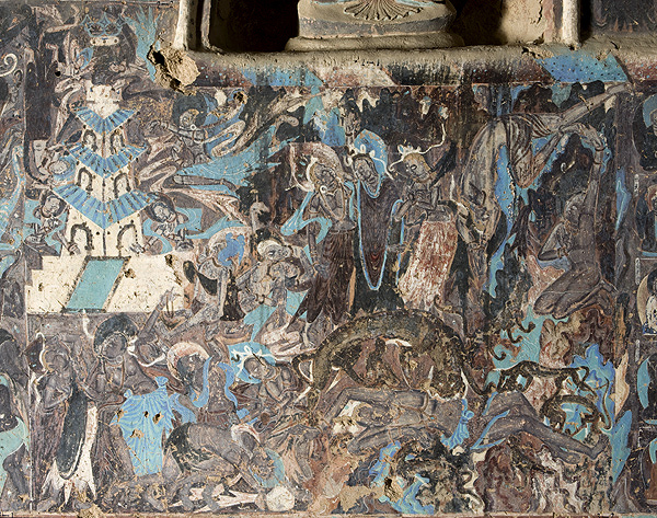 作為莫高窟北周壁畫的代表作,第428窟《薩埵太子本生》突破了傳統(tǒng)單幅畫面的局限,以三層長卷分欄鋪陳。畫師巧妙運用群山作為情節(jié)分隔,既保持畫面獨立性,又通過蜿蜒的“S”形布局引導觀者視線自然流轉。