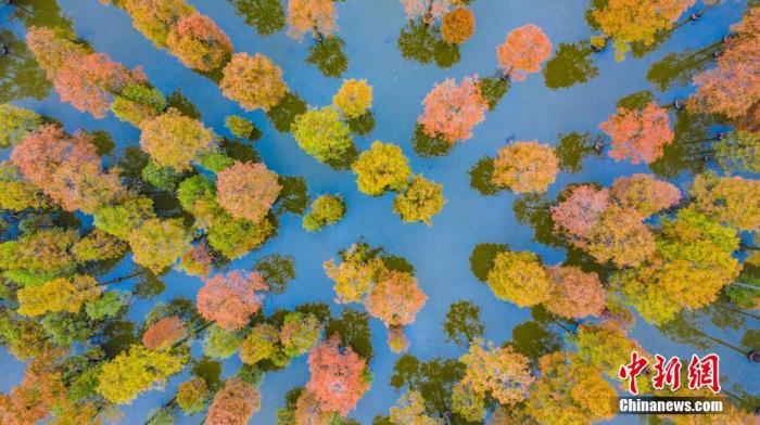 資料圖:初冬季節(jié),湖北武漢新洲區(qū)漲渡湖濕地數(shù)千棵水杉葉紅似火、五彩斑斕,美景如畫。中新社發(fā) 趙廣亮 攝