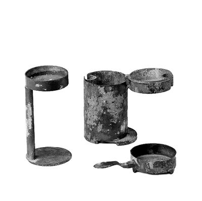 這件青銅鑄造的鼎形燈,收合時(shí)為附耳三足蓋鼎,內(nèi)盛燃燈時(shí)所用的油料,以子母口扣合。蓋中央為一突起的圓柱狀銎,蓋兩側(cè)為相對的二鴨首,其寬嘴正好銜住雙鍵,鼎蓋便被牢牢扣住。用燈時(shí),將雙鍵支起,可插入鼎蓋中心的圓銎中,鼎蓋即成為燈盞。鼎形燈構(gòu)造精巧,設(shè)計(jì)科學(xué),使用方便,封口嚴(yán)密不溢油,為貴族出行時(shí)使用的燈。