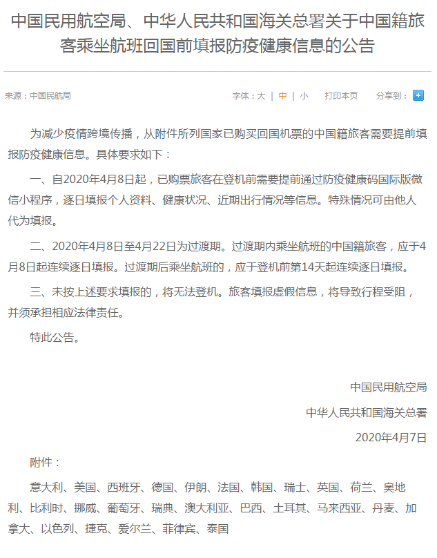 中國民用航空局、中華人民共和國海關(guān)總署4月7日聯(lián)合發(fā)布《關(guān)于中國籍旅客乘坐航班回國前填報防疫健康信息的公告》(以下簡稱《公告》)?!豆妗分赋觯?/span>自4月8日起,從意大利、美國、西班牙等26個國家已購買回國機票的中國籍旅客需要在登機前提前填報防疫健康信息,包括逐日填報個人資料、健康狀況、近期出行情況等。旅客未按要求填報的,將無法登機;填報虛假信息,將導(dǎo)致行程受阻,并須承擔(dān)相應(yīng)法律責(zé)任。