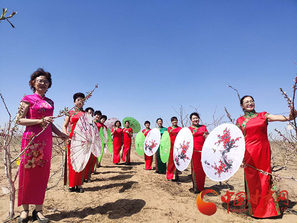 中國(guó)甘肅網(wǎng)4月25日訊(本網(wǎng)記者 張振國(guó) 文/圖)人間四月芳菲盡,大漠桃花始盛開(kāi)。4月25日,騰格里沙漠邊緣、涼州大漠桃花即將開(kāi)放之際,由甘肅恒榮綠洲治沙科技有限公司舉辦的首屆“恒榮·漠上云桃”桃花節(jié)在涼州區(qū)紅水河西該公司生態(tài)經(jīng)濟(jì)林產(chǎn)業(yè)化經(jīng)營(yíng)試驗(yàn)基地“恒榮桃園”開(kāi)幕。