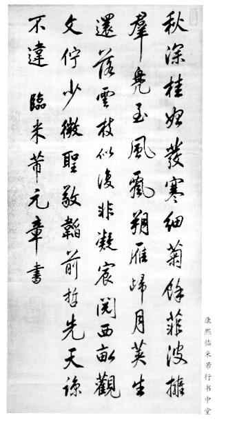 《張掖文物》中有一幅《康熙臨米芾行書中堂》。這幅作品為紙本,縱230厘米,橫77厘米,共計5行,縱橫飄逸,平淡古樸,為康熙臨寫米芾的大字行書。