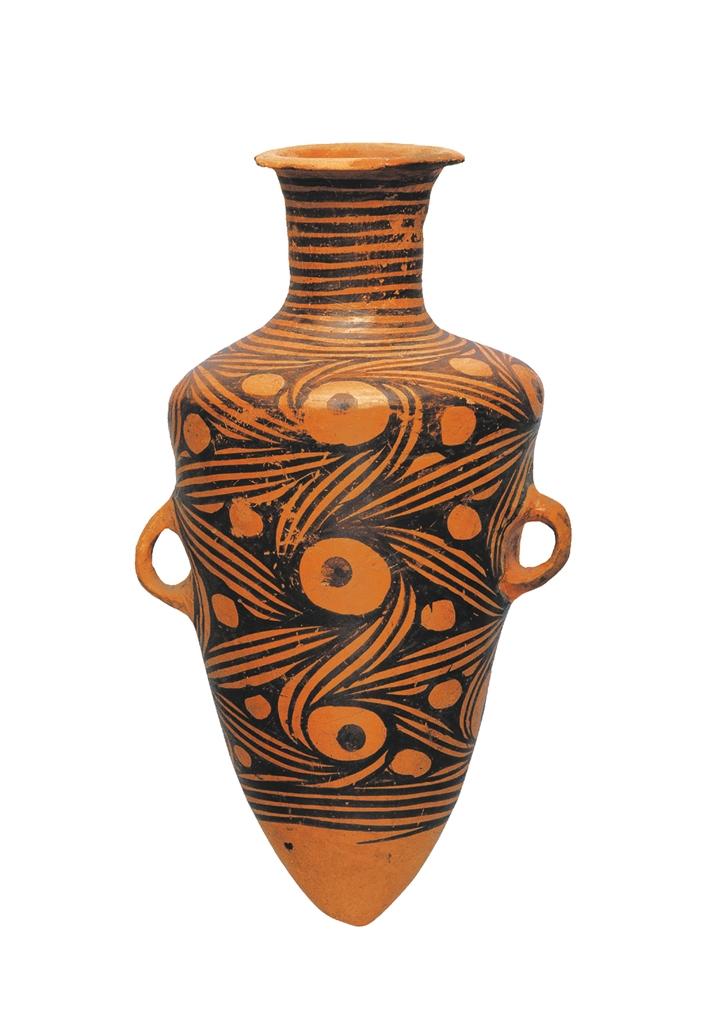 馬家窯文化馬家窯類型(距今約4800年),1971年隴西縣首陽公社呂家坪出土。這只彩陶瓶最亮眼的特點(diǎn)當(dāng)屬瓶身上三組旋渦紋了,這三組用黑彩繪就的連續(xù)旋渦紋與瓶頸的平行弦紋聯(lián)系,圖案華美勻稱,連綿不斷卻疏密有致,真難想象,近5000年前的古人繪畫技藝竟如此精湛!這只彩陶瓶另有一個(gè)奇特處同學(xué)們發(fā)現(xiàn)了嗎?此瓶的瓶底為什么是尖的,尖底可怎么置放?想必是用繩子系著瓶的兩耳懸掛著用的。