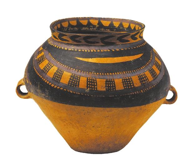 馬家窯文化半山類型(距今約 4500 年),廣河縣地巴坪出土。這是雙耳甕器型大氣貴重,施以紅、黑二彩,紅、黑彩交替使用,腹部繪多層連續(xù)垂弧紋和鋸齒紋,黑、紅彩交替使用,由三組分層連續(xù)的垂弧紋組成整體圖案,每層由兩層黑色帶紋和一層紅色帶紋組成,黑色帶紋上緣繪向上的鋸齒紋。整個(gè)圖案密集繁復(fù),俯視猶如一朵盛開的鮮花,造型豐滿,色彩鮮艷。