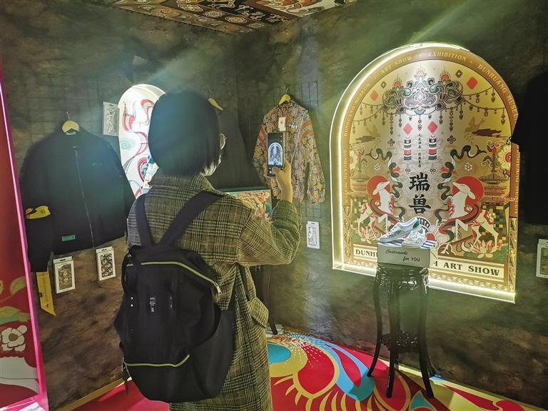此次開幕式活動(dòng)展出的“潮起敦煌”主題文創(chuàng)展,以“瑞圖·大盛敦煌”“瑞景·自古不羈”“瑞趣·千年弄潮”三大版塊為主題,通過敦煌流散海外文物復(fù)制品展示、敦煌博物館·絲路手信、敦煌國潮文創(chuàng)品展示等互動(dòng)式體驗(yàn),用豐富的敦煌元素和獨(dú)特的色彩碰撞,將傳統(tǒng)+國潮、視覺+體驗(yàn)展現(xiàn)的相得益彰,讓觀眾充分感受敦煌文化的魅力與活力。
