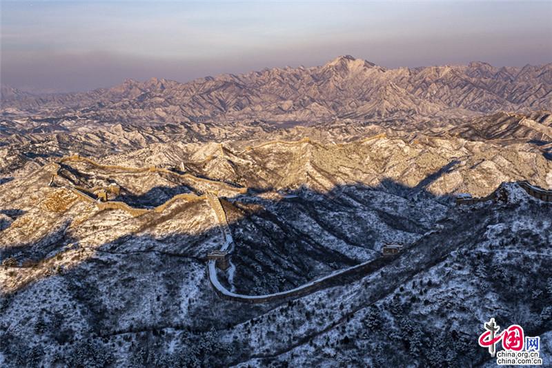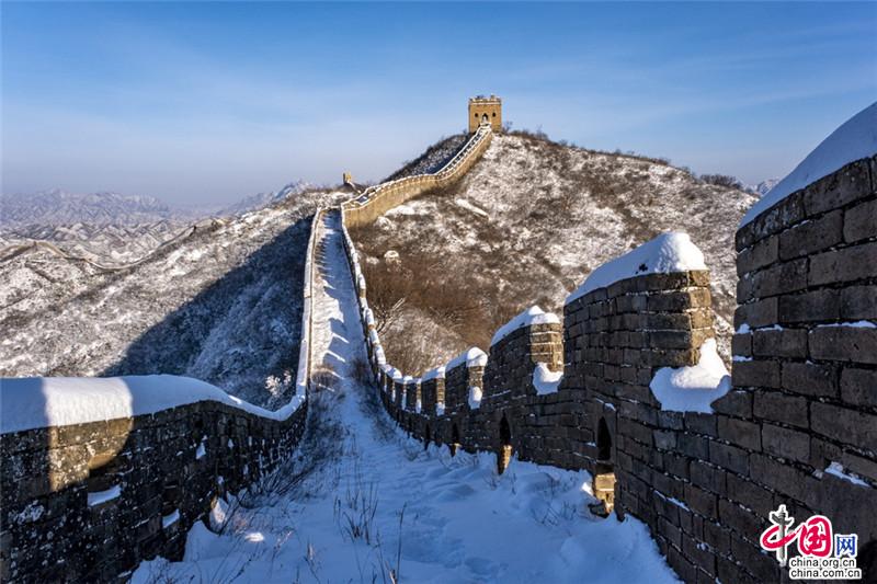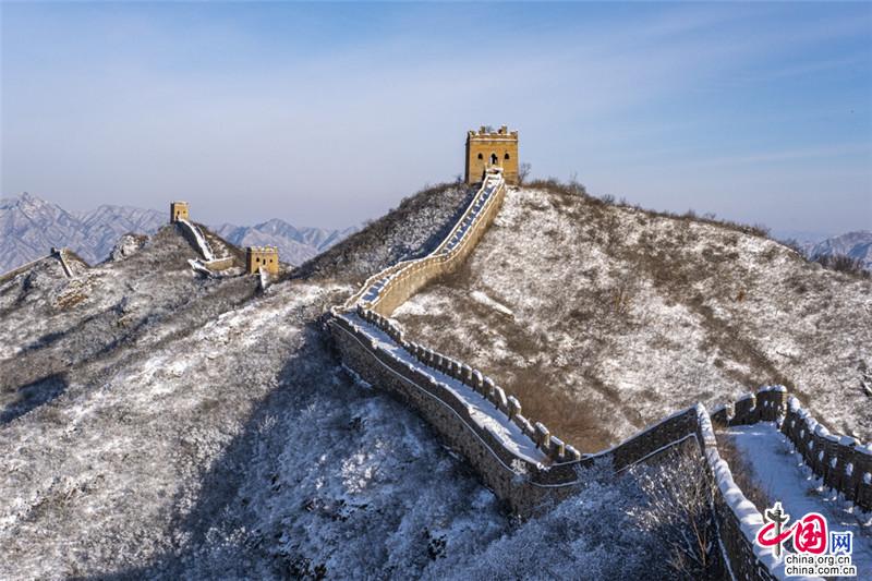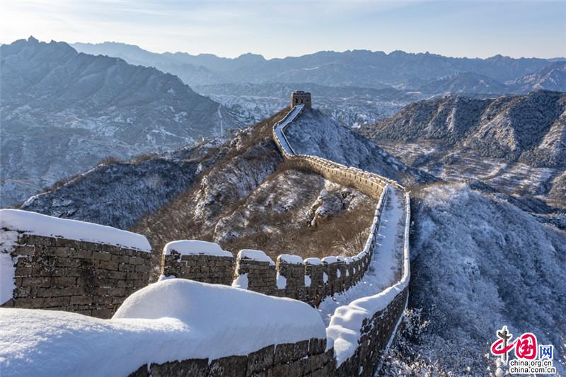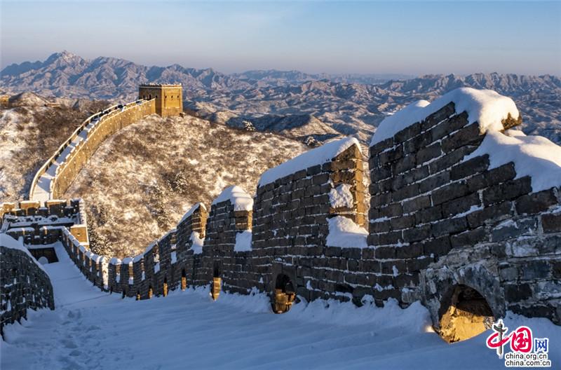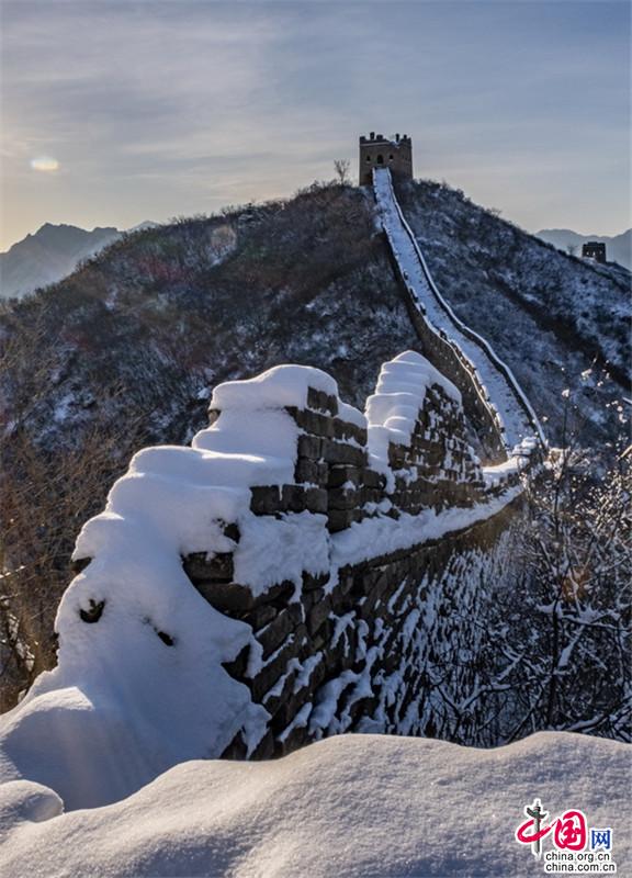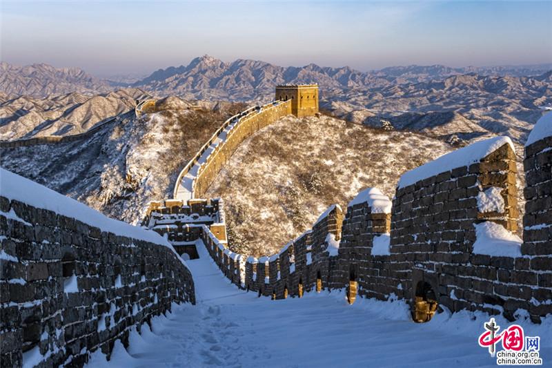 皚皚白雪覆蓋長城內(nèi)外,銀裝素裹金山嶺氣勢磅礴。