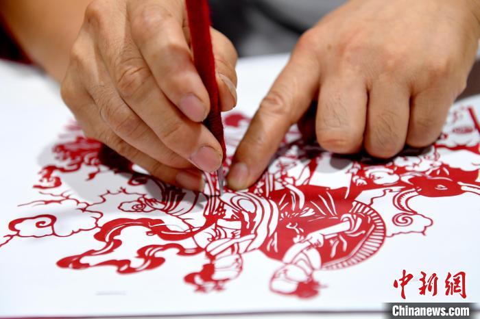 尤金水在剪刻《鵲橋相會(huì)》剪紙作品 苗鳳強(qiáng) 攝