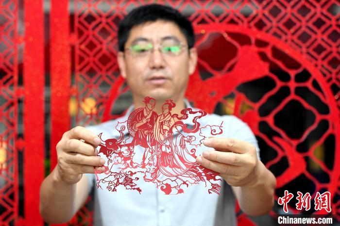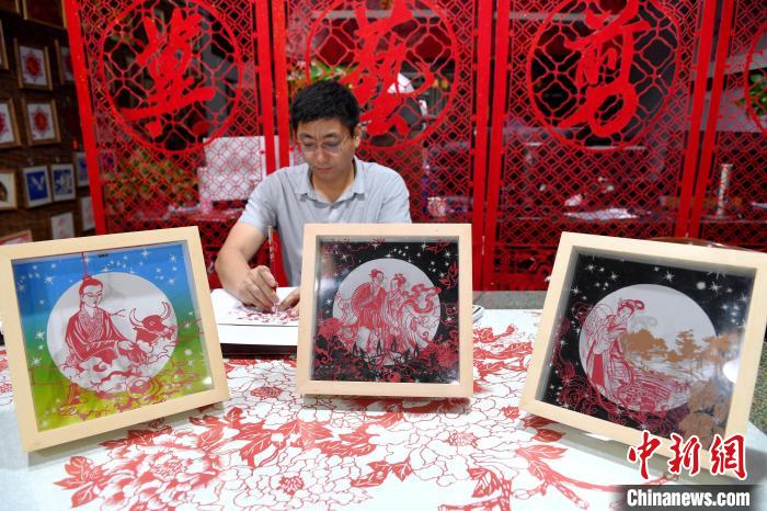 8月4日,是中國(guó)傳統(tǒng)節(jié)日七夕節(jié)。河北省衡水市阜城縣剪紙藝人尤金水創(chuàng)作了《牛郎》《織女》《鵲橋相會(huì)》三幅“七夕”剪紙作品,傳遞千年浪漫情。據(jù)介紹,作品采用阜城剪紙陽(yáng)刻的手法,裝裱后利用立體投影的方式,可以把畫面投影到“月亮”上,既浪漫又神奇。