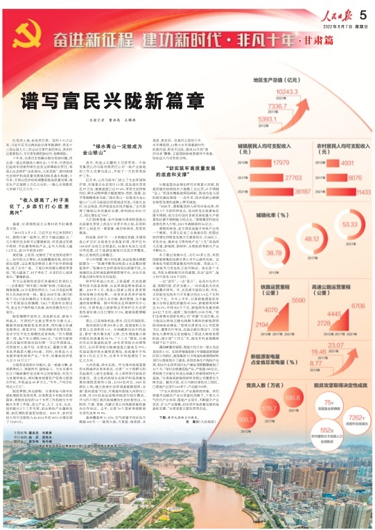 8月7日,人民日?qǐng)?bào)刊發(fā)“奮進(jìn)新征程 建功新時(shí)代·非凡十年”甘肅篇,重磅推出兩塊整版,聚焦黨的十八大以來,隴原兒女牢記習(xí)近平總書記的殷切囑托,踔厲奮發(fā)、銳意進(jìn)取,埋頭苦干、勇毅前行,加快建設(shè)幸福美好新甘肅,不斷開創(chuàng)富民興隴新局面。