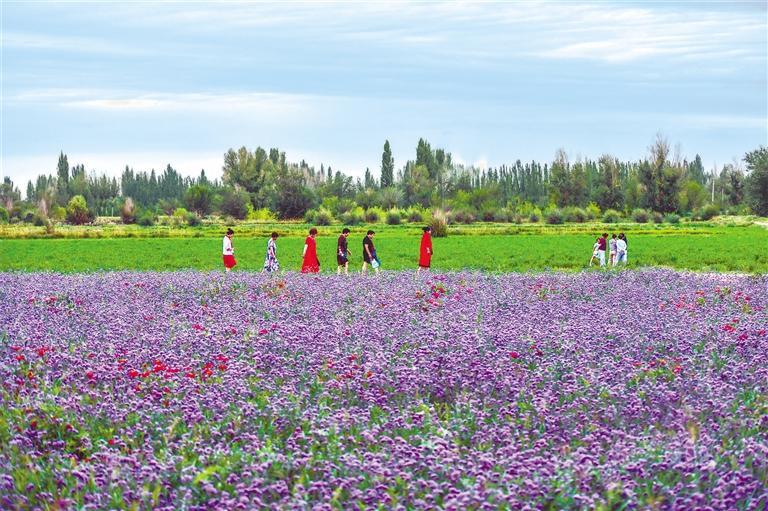 8月7日,游人在敦煌月牙泉鎮(zhèn)百畝花田游覽。 新甘肅·甘肅日?qǐng)?bào)通訊員 王斌銀