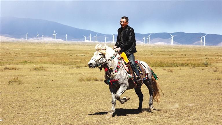 驅車向草原腹地進發(fā),遠遠就能看見有人在馴馬。馴馬者房利軍和他的坐騎“尕青”仿佛“人馬合一”,同呼吸、共步調(diào),一遍遍練習,像走,更像飛。這便是傳說中的走馬文化,和跑馬的加速度不同,走馬不管是走還是跑,都是快步勻速,短途速度快,長途耐力強,騎乘平穩(wěn),姿態(tài)優(yōu)美,觀賞性強。在牧區(qū),走馬實用性強,深受當?shù)厝藲g迎。曾有專家稱,“馬踏飛燕”的“馬”即為走馬。每天,和武威天祝一山之隔的這片草原,都與房利軍有關,在這里,他專心馴馬,而他的500只羊則在一旁撒歡。尤其從高空俯瞰,草原牧羊的畫面甚是壯觀??赐犟Z馬,房利軍騎馬帶路,采訪車沿著馬道回到了“家”。