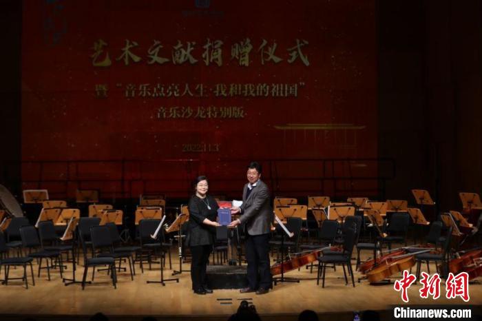 國(guó)家圖書(shū)館重要藝術(shù)文獻(xiàn)捐贈(zèng)儀式暨“音樂(lè)點(diǎn)亮人生·我和我的祖國(guó)——音樂(lè)沙龍?zhí)貏e版”活動(dòng)3日晚在國(guó)圖藝術(shù)中心·音樂(lè)廳舉辦。國(guó)家圖書(shū)館黨委書(shū)記、副館長(zhǎng)魏大威接受捐贈(zèng),并為捐贈(zèng)人代表中央民族歌舞團(tuán)民樂(lè)團(tuán)團(tuán)長(zhǎng)馬蘭花頒發(fā)捐贈(zèng)證書(shū)。