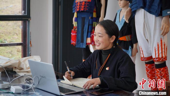 在朵努社區(qū)的織繡坊內,26歲的白褲瑤居民黎秋憶正在電腦前繪聲繪色地演講。此時的她正作為瑤族服飾非遺傳承人,參加廣西全區(qū)青年創(chuàng)業(yè)創(chuàng)新大賽。
