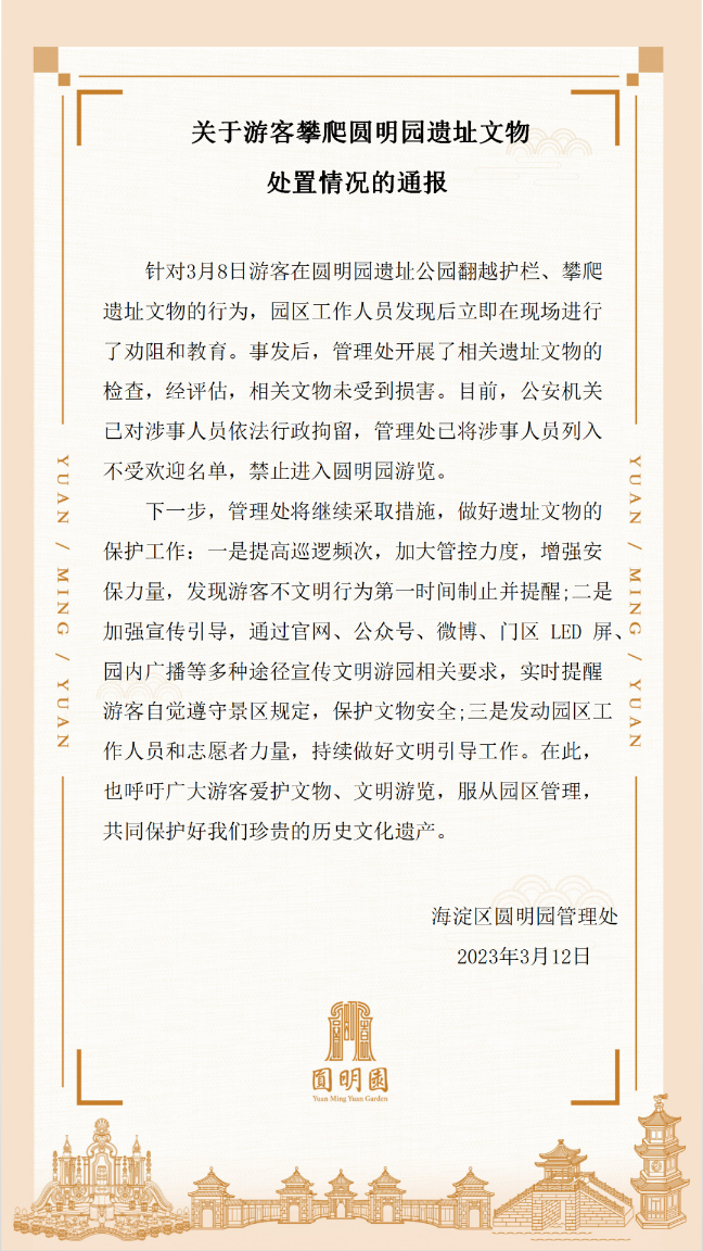 《通報》指出,針對3月8日游客在圓明園遺址公園翻越護(hù)欄、攀爬遺址文物的行為,園區(qū)工作人員發(fā)現(xiàn)后立即在現(xiàn)場進(jìn)行了勸阻和教育。事發(fā)后,管理處開展了相關(guān)遺址文物的檢查,經(jīng)評估,相關(guān)文物未受到損害。目前,公安機關(guān)已對涉事人員依法行政拘留,管理處已將涉事人員列入不受歡迎名單,禁止進(jìn)入圓明園游覽。