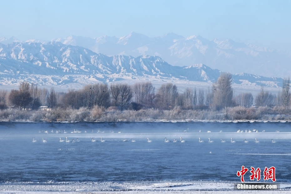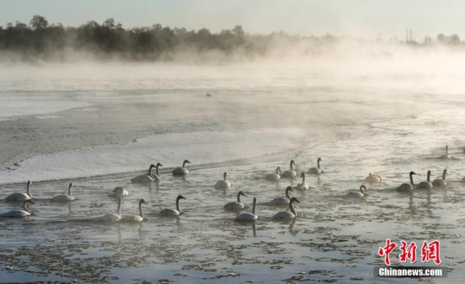 1月21日清晨,甘肅張掖市黑河國家級(jí)自然保護(hù)區(qū),受低溫影響,黑河水面霧氣氤氳縹緲,天鵝在水中暢游,野鴨等候鳥在空中飛舞,宛如一幅水墨生態(tài)畫卷。圖/CNSphoto 成 林 攝