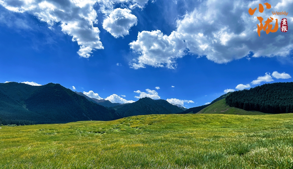 一片碧綠的草地,一望無際,像一片綠色的地毯鋪向遠方,伴著藍天白云和遠處森林、群山,構(gòu)成了一幅美麗的風景畫。