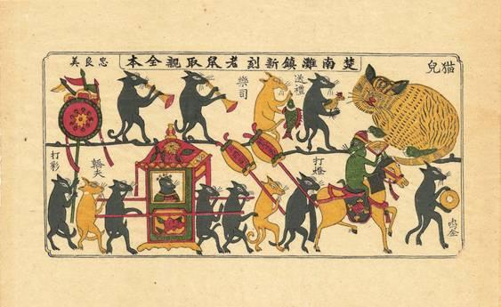 忠良美作坊收藏的清代古版復(fù)刻年畫《老鼠娶親》,該年畫采用古法天然顏料純手工印制,色彩斑斕,古味濃郁