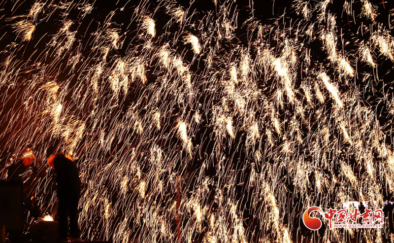 10月5日晚,位于甘肅省張掖市甘州區(qū)的玉水苑生態(tài)景區(qū)內(nèi),非遺傳承人在為游客和市民表演國家級非遺項目打鐵花。(王將 攝)