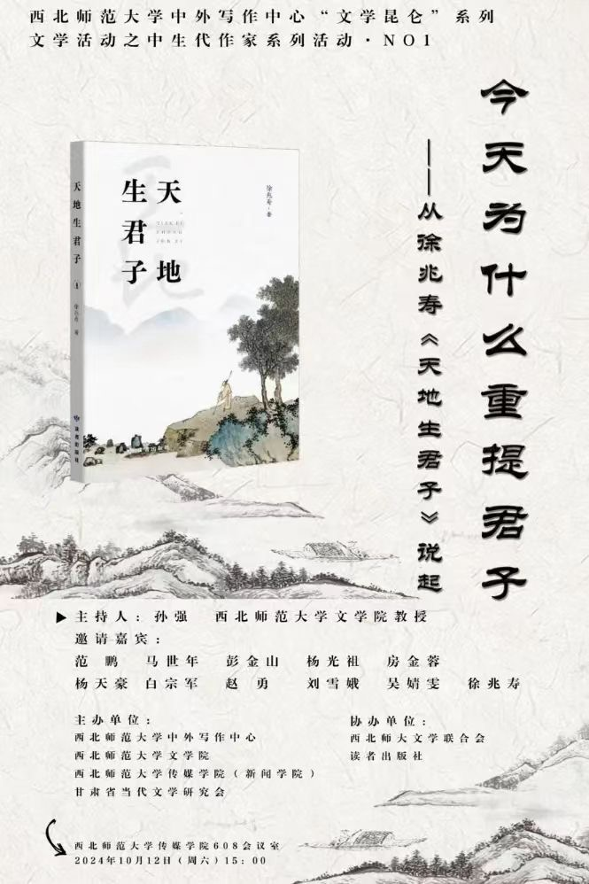 2024年10月12日,由西北師范大學(xué)中外寫作中心、西北師范大學(xué)文學(xué)院、西北師范大學(xué)傳媒學(xué)院、甘肅省當(dāng)代文學(xué)研究會(huì)聯(lián)合主辦的“文學(xué)昆侖”之中生代作家系列活動(dòng)“今天為什么重提君子——從徐兆壽《天地生君子》說起” 徐兆壽《天地生君子》作品分享會(huì)在西北師范大學(xué)舉辦。