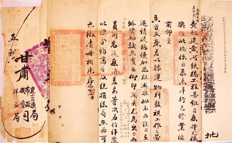 清宣統二年(1910年)5月,陜甘總督長庚褒獎修建黃河鐵橋官員批文。