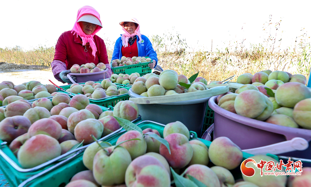 10月24日,在張掖市甘州區(qū)長安鎮(zhèn)萬通果蔬種植專業(yè)合作社“甘泉雪桃”種植基地大棚內(nèi),種植戶正在為甘肅蘭州和青海西寧的客戶采摘裝運“甘泉雪桃”。