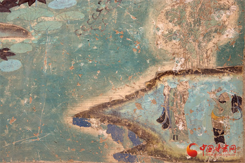 兩幅作品均以青綠色調(diào)為主,觀音面部貼金雖已氧化,卻仍顯清新淡雅,更以“馬一角、夏半邊”的構(gòu)圖巧思,用對(duì)角線分割畫面、大量留白,讓有限的壁面生出無窮空間感,堪稱中國(guó)傳統(tǒng)美學(xué)與佛教哲理的完美融合——正如唐代白居易贊水月觀音“凈淥水上,虛白光中”,這般意境在榆林窟的壁畫里被演繹得淋漓盡致。