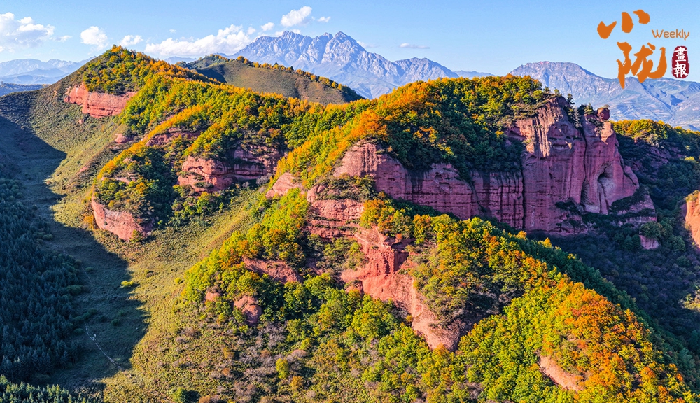 俯瞰整個(gè)冶力關(guān),遠(yuǎn)處的雪峰在陽光照耀下泛著銀光,與近處的彩林形成鮮明對比,宛如一幅氣勢磅礴的山水畫卷。