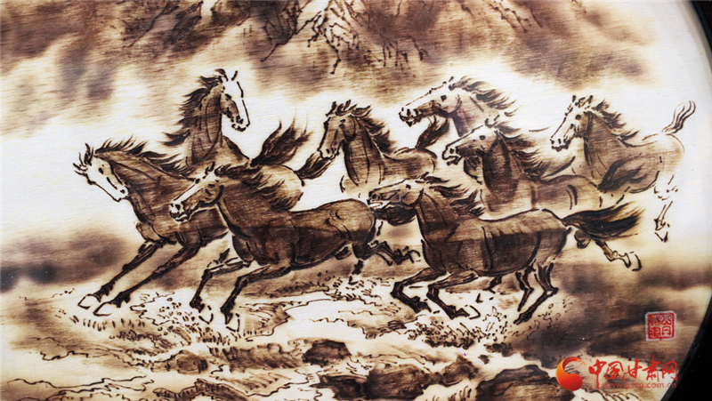 從學徒到代表性傳承人,張志光的堅守藏在日復一日的練習里。他不僅精通山丹烙畫的選材、畫面設(shè)計及裝飾工藝,更在2018年邁出創(chuàng)新步伐——將山丹馬元素融入創(chuàng)作。手持電烙鐵在木板上游走,他筆下的山丹馬或奔騰跳躍、或昂首嘶鳴,線條流暢、明暗有致,仿佛被賦予生命,盡顯西北大地的豪邁神韻。“山丹烙畫是我一生的熱愛,早成了生活里離不開的部分。”張志光的話語里,滿是對這門技藝的深情。