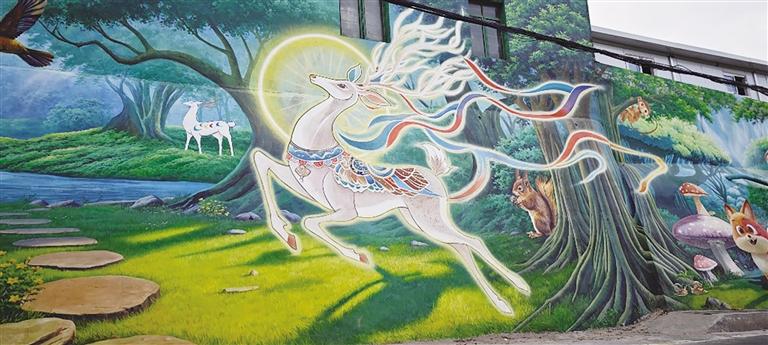 這些色彩斑斕的墻繪以城關(guān)區(qū)深厚的文化底蘊(yùn)為底色,將民俗風(fēng)情、自然生態(tài)與城市記憶巧妙交織。在伏龍坪街道,一面巨幅“舞獅”墻繪氣勢恢宏,紅黃相間的獅子昂首騰躍;在山間步道旁,“九色鹿”悠然立于云霧之間,靈動雙眸映照山河,將敦煌文化的神秘與自然之美娓娓道來。